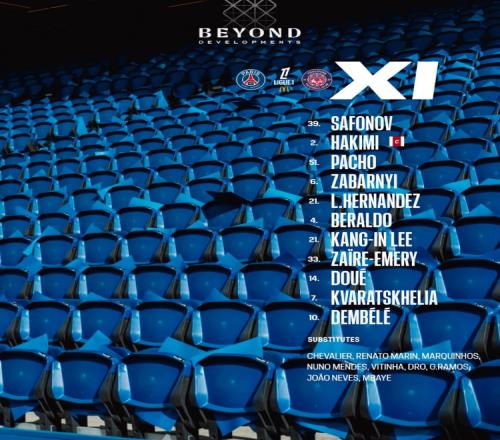 39-薩福諾夫、2-阿什拉夫、51-帕喬、6-扎巴爾尼、21-盧卡斯、4-貝拉爾多、21-李剛?cè)省?3-扎伊爾·埃梅里、14-杜埃、7-克瓦拉茨赫利亞、10-登貝萊