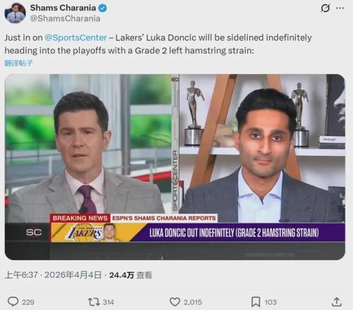 北京時(shí)間4月4日上午6點(diǎn)半,據(jù)NBA名記Shams與Dave McMenamin聯(lián)合報(bào)道,湖人球星東契奇被診斷為左腿筋二級(jí)拉傷,不僅常規(guī)賽報(bào)銷,季后賽也是無限期缺陣。腿筋二級(jí)拉傷在NBA的平均缺席時(shí)間為35天,大約15場(chǎng)比賽。