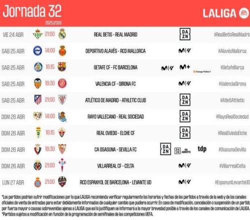 北京時(shí)間4月4日,西甲官方公布了聯(lián)賽第32輪各場(chǎng)比賽的具體開球時(shí)間。