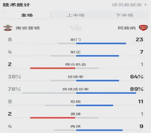 控球率64%,射門23比8,預期進球1.77比1.21。阿森納把能占的優(yōu)勢全占了,唯獨沒占住比分牌。