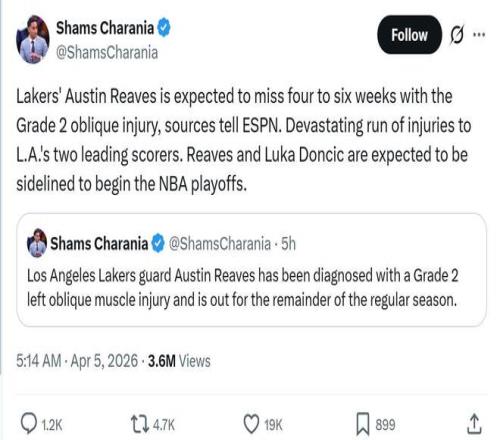 里夫斯的傷病不僅將影響他的續(xù)約前景,對(duì)于湖人隊(duì)來說更是堪稱毀滅性打擊,因?yàn)樵谇耙惶烨蜿?duì)大當(dāng)家東契奇才因?yàn)橥冉疃?jí)拉傷常規(guī)賽報(bào)銷。