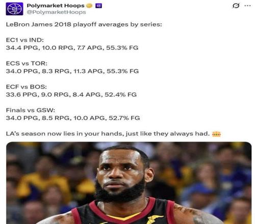 美媒Polymarket Hoops曬出18年“滅霸詹”數(shù)據(jù)配文道:“湖人的命運(yùn)掌控在你的手中,正如往常一樣?!?/p>