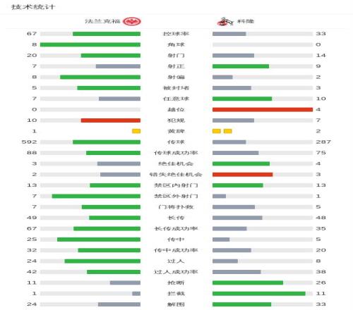 北京時間4月5日德國足球頂級聯(lián)賽 聯(lián)賽 第28輪,法蘭克福主場對陣科隆。法蘭克福伯卡特破門,卡利穆恩多破門??坡】魉够崎T,卡斯特羅-蒙泰斯破門。最終比分法蘭克福 2-2 科隆。