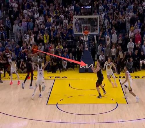 比賽最后時刻,勇士落后1分,庫里選擇將球掌控在自己手里,從后場運到前場。追夢過來給他擋拆,防守人由阿門換成小賈,庫里胯下運球之后急停強行扔出三分,將球隊命運系于這一球??上У氖牵蜃罱K偏出。