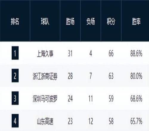 上海久事以32勝3負(fù)高居榜首,領(lǐng)先第二名浙江廣廈3個(gè)勝場(chǎng),冠軍獎(jiǎng)杯已近在咫尺。球隊(duì)攻防兩端穩(wěn)定性極強(qiáng),核心球員狀態(tài)持續(xù)在線,基本鎖定本賽季常規(guī)賽頭名。廣廈雖同樣取勝,但與上海的勝場(chǎng)差距已難以彌補(bǔ),爭(zhēng)冠希望渺茫,重心或?qū)⑥D(zhuǎn)向季后賽深度布局。