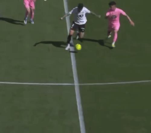第二個(gè)場(chǎng)景:瓦倫西亞球員明顯控球并向隊(duì)友傳球,之后塞爾塔球員伸腿插入其技術(shù)動(dòng)作的行進(jìn)路線。瓦倫西亞球員自然落地支撐腳時(shí)踩到了對(duì)方。