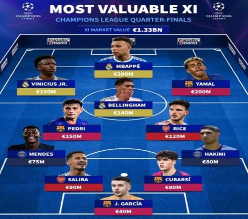 德轉(zhuǎn)列歐冠八強戰(zhàn)最貴陣:姆巴佩、亞馬爾領(lǐng)銜,皇馬3將、巴薩4人
