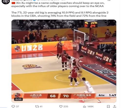 有美國(guó)媒體指出,有多所NCAA大學(xué)關(guān)注起了這位來(lái)自CBA的中鋒,稱(chēng)贊徐昕有著不錯(cuò)的敏捷性和天賦。