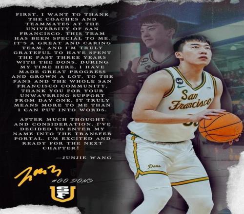 中國(guó)男籃國(guó)手王俊杰宣布將轉(zhuǎn)校感謝過(guò)去3年在舊金山大學(xué)的時(shí)光