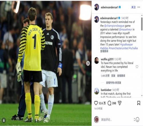 傳奇門(mén)將范德薩社媒曬出昔日與諾伊爾交手的合照,配文:“昨天的比賽讓我想起了2011年在歐冠賽場(chǎng)對(duì)陣才華橫溢的諾伊爾,當(dāng)時(shí)我自己也40歲了!昨晚看到他奉獻(xiàn)與當(dāng)年同樣出色的表現(xiàn),但時(shí)間已經(jīng)過(guò)去了15年,真是令人印象深刻!”