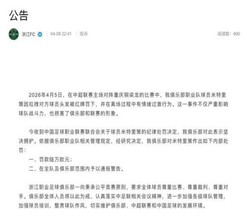 • 浙江隊(duì)補(bǔ)刀:俱樂(lè)部?jī)?nèi)部罰款6萬(wàn)歐元(近50萬(wàn)人民幣),全隊(duì)通報(bào)批評(píng)。