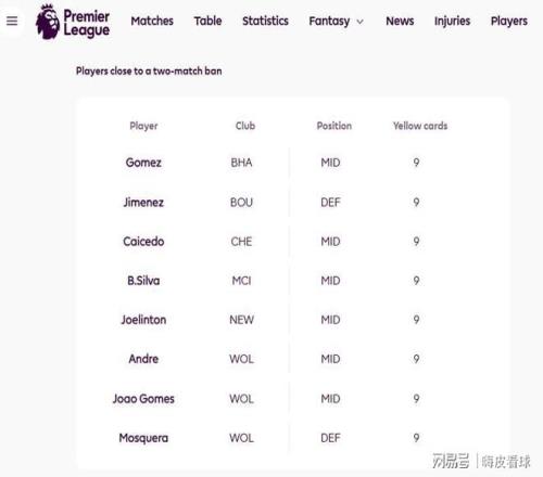 這就是球迷通常所說的“清零”節(jié)點(diǎn),這個周末是第32輪,來到本賽季累積黃牌的第二個節(jié)點(diǎn)。英超官方公布,一共有8名球員,已經(jīng)拿到9張黃牌,本輪再得到一張的話,就要自動停賽兩場。其中墊底的狼隊(duì)有3人,曼城和切爾西兩大豪門,分別有B席和凱塞多兩名中場。