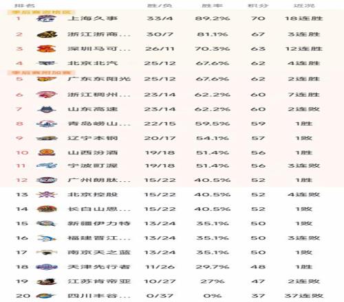 隨著深圳12連勝,浙江9572山東,CBA最新排名出爐!山西第10
