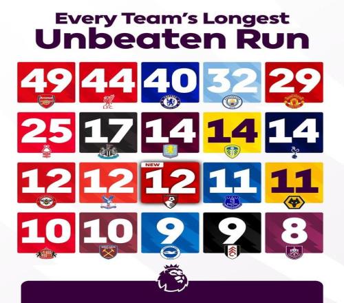 在伯恩茅斯創(chuàng)造隊史英超最長不敗紀錄后,英超官方列出本賽季英超各支球隊的歷史英超最長不敗紀錄。
