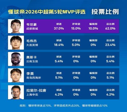 大家好,歡迎來到懂球帝2026賽季中超MVP的評選現(xiàn)場。成都蓉城隊長韋世豪憑借與國安一役中的出色表現(xiàn),以62%的得票率大幅領(lǐng)先,成功當(dāng)選!