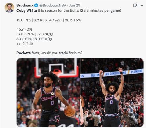 在懷特被擺上貨架后,火箭記者Bradeaux就寫道,懷特在公牛場均28.8分鐘可以拿到19分4.7助攻3.5籃板,三分命中率37%,真實(shí)命中率60.6%,火箭球迷們喜歡他來嗎?
