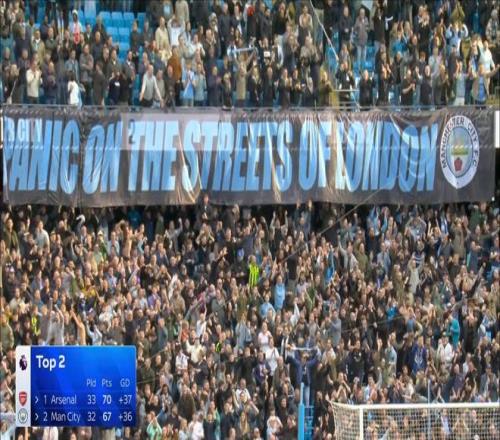 在伊蒂哈德球場的看臺上,當(dāng)主裁吹響終場哨音,一面充滿嘲諷意味的巨大橫幅緩緩降下——“倫敦街頭的恐慌(Panic on the streets of London)”。就在曼城以2-1驚險擊敗阿森納,將積分差距縮小到3分且少賽一場的幾秒鐘后,這條橫幅從看臺上垂下。
