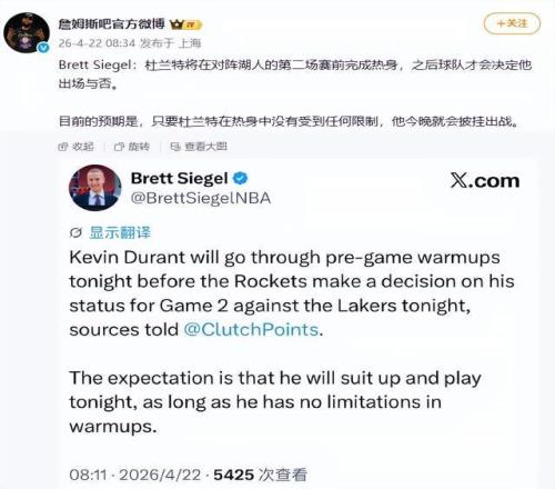 據(jù)名記SHAMS透露,杜蘭特將在賽前熱身結(jié)束后,根據(jù)身體反應(yīng)最終決定是否出戰(zhàn)?;鸺?duì)內(nèi)部持樂(lè)觀態(tài)度,期待這位領(lǐng)袖能挺身而出。