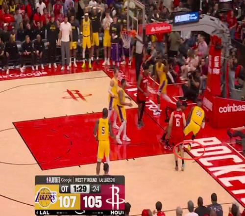 第二次漏判發(fā)生在距離加時(shí)賽結(jié)束還有1分29秒。裁判報(bào)告指出,詹姆斯在與火箭球員拼搶時(shí)拿到球,但這時(shí)他的腳已經(jīng)出界,裁判沒有響哨。雖然這一球理論上是湖人獲利,但詹姆斯救球回來,火箭又得到球權(quán)。這一漏判的影響,對比賽來說沒有上一次那么明顯。