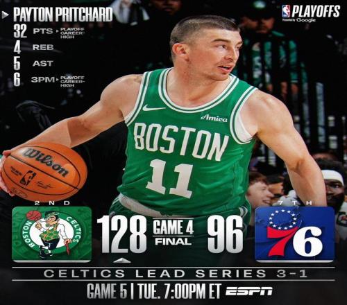 末節(jié)決戰(zhàn),凱爾特人延續(xù)著進攻端的出色表現(xiàn),并將分差擴大至30分以上,76人追分乏力,比賽早早失去了懸念。兩隊逐漸換上板凳席末端的球員,時間很快走完。最終,波士頓以128比96完勝費城,將大比分改寫為了3比1并就此奪下了賽點。雙方的G5對決,將在凱爾特人主場進行。