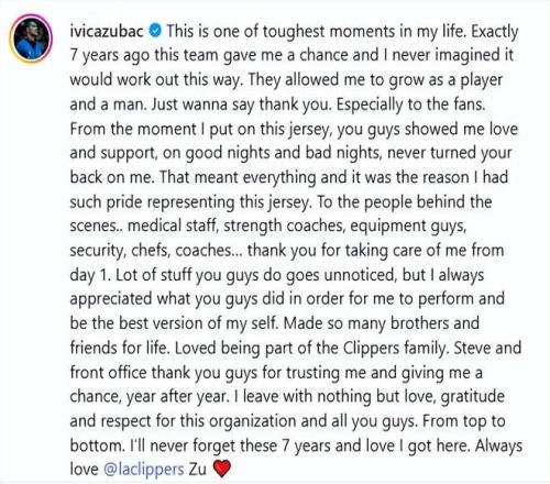 這是我人生中最艱難的時(shí)刻之一。整整七年前,這支球隊(duì)給了我機(jī)會(huì),我從未想過(guò)會(huì)以這樣的方式結(jié)束。他們見(jiàn)證了我從一名球員到一個(gè)男人的成長(zhǎng)蛻變。千言萬(wàn)語(yǔ),唯有感謝。尤其要感謝球迷們。從我披上這件球衣的那一刻起,無(wú)論順境逆境,你們始終對(duì)我傾注愛(ài)意與支持,從未離棄。這份情誼重于一切,也是我身披快船戰(zhàn)袍時(shí),心中滿溢自豪的源泉。