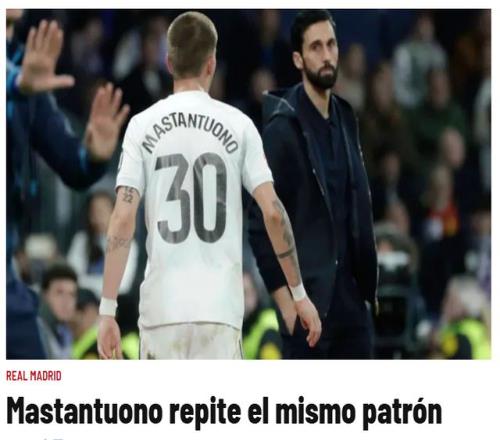 18歲的馬斯坦托諾,再次回歸替補(bǔ)席。3月5日,《馬卡報》和《阿斯報》撰文,分析阿根廷小馬哥的處境。阿隆索、阿韋洛亞兩任皇馬主帥,都非常信任馬斯坦托諾,但阿根廷小將未能證明自己。