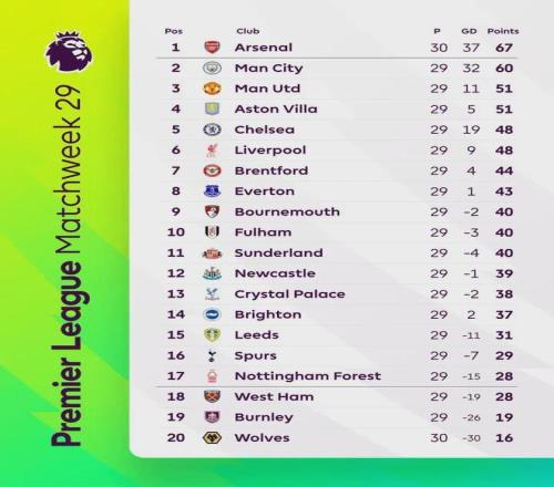 北京時(shí)間3月6日凌晨,英超第29輪最后一場(chǎng)比賽戰(zhàn)罷,水晶宮3比1取勝托特納姆熱刺,送對(duì)手聯(lián)賽5連敗和11輪不勝。積分榜方面,阿森納1比0小勝布萊頓,而曼城2比2遭諾丁漢森林逼平,槍手多賽一場(chǎng)領(lǐng)先優(yōu)勢(shì)擴(kuò)大至7分;十人紐卡斯?fàn)柭?lián)2比1絕殺曼聯(lián),送對(duì)手自卡里克上任以來(lái)首敗,目前曼聯(lián)與維拉同積51分排名第三、第四;切爾西憑借本輪大勝維拉,反超本輪1比2遭狼隊(duì)爆冷絕殺的利物浦來(lái)到第五位,紅軍跌至第六。
