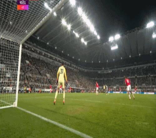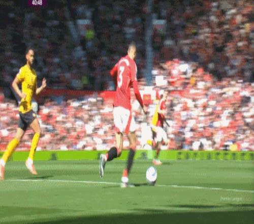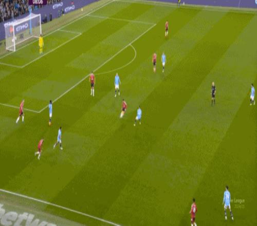 這可能是馬拉西亞的站位更多防范外線,給內(nèi)線留出空間的選擇的原因,但也正是因此,馬奎爾的移動(dòng)和站位剛好處于一個(gè)非常尷尬的位置,既沒有封堵住他的逆足射門,也同步阻擋了拉門斯的視線: