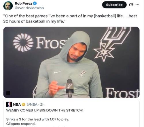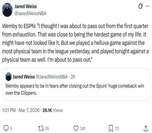 雖然只是一場常規(guī)賽,但能夠完成如此夸張的大逆轉(zhuǎn),對手還是昔日核心小卡帶領(lǐng)的快船,賽后馬刺球員十分激動,全員瘋狂慶祝,文班更是直接抱著隊(duì)友喜極而泣。