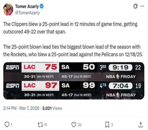 25分驚天大逆轉(zhuǎn)也成功追平本賽季最大逆轉(zhuǎn)分差,此前這一紀(jì)錄由鵜鶘逆轉(zhuǎn)火箭保持。