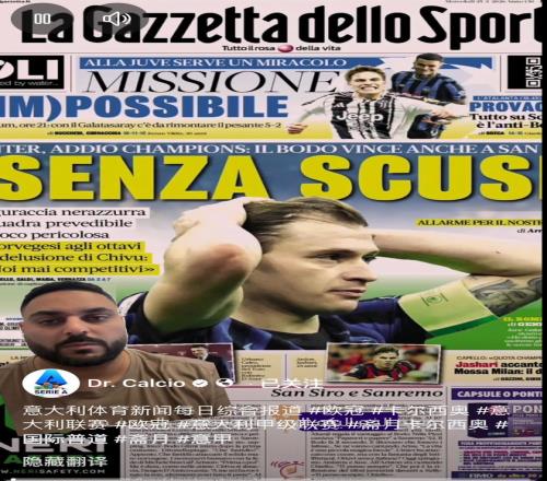 我后來(lái)去他的主頁(yè)看了他發(fā)布的內(nèi)容:照片主要是分享各類(lèi)資訊;視頻則是兩類(lèi),其中一類(lèi)是他出鏡的視頻,背景是《米蘭體育報(bào)》的封面,我猜測(cè)他是對(duì)《米蘭體育報(bào)》的相關(guān)封面報(bào)道進(jìn)行延伸解讀。另一類(lèi)則是他現(xiàn)場(chǎng)拍攝的比賽片段。