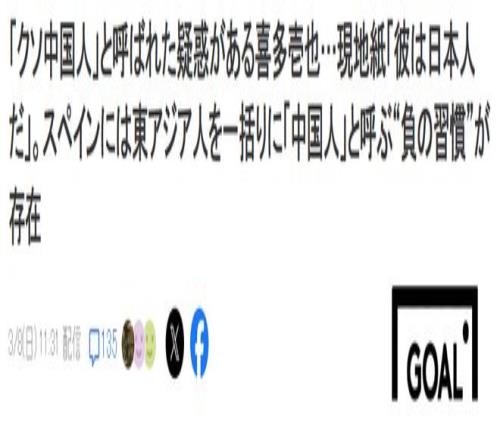 效力于皇家社會B隊的日本后衛(wèi)喜多壱也,在3月7日的一場比賽中疑似遭遇了種族歧視事件。