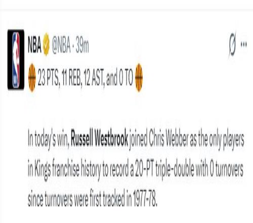 8.威少與韋伯一同成為國王隊(duì)史唯二能拿到20+三雙且0失誤的球員。