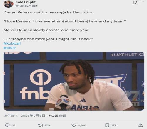 眾所周知,2026年NBA選秀大會有三大狀元熱門:AJ-迪班薩、達林-彼得森和卡梅隆-布澤爾。萬萬沒想到,前兩個已經(jīng)喊著要退選了。達林-彼得森說道:“我愛堪薩斯,我愛這里的一切,我愛我的球隊,我可能會回來再打一年。”