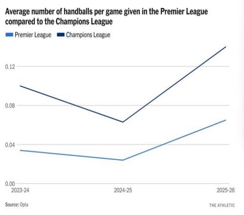 統(tǒng)計數(shù)據(jù)很清晰。歐冠聯(lián)賽中因手球犯規(guī)被判罰點球的次數(shù)是英超的兩倍多。