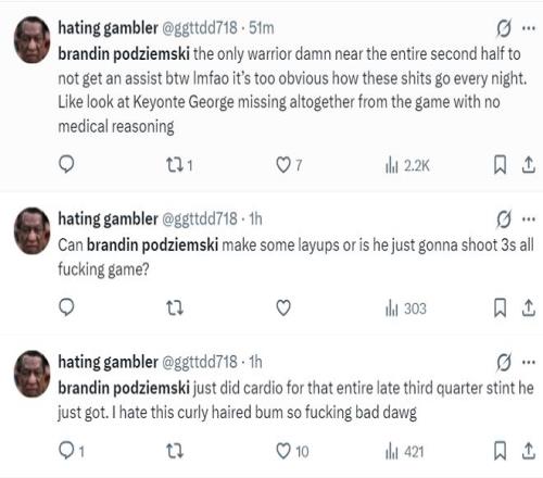勇士球迷實(shí)在是忍無可忍的開噴了:波杰姆斯基這個(gè)家伙整個(gè)下半場(chǎng)就1次助攻簡(jiǎn)直太離譜了,這家伙為了數(shù)據(jù)每一晚的套路實(shí)在是太明顯了令人想笑。完全不懂突破,只會(huì)在外面飄著投籃,我真XX的討厭這個(gè)卷發(fā)的混蛋。