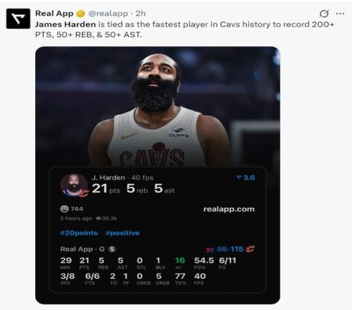 6.11場比賽完成200分50籃板50助攻并列騎士隊史最快;