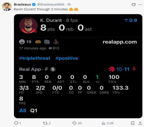 37歲的杜蘭特繼續(xù)被啃老,在申京狀態(tài)無比低迷的情況下,開場(chǎng)3分鐘里杜蘭特一人拿到8分,首節(jié)杜蘭特7中5+三分2中2,拿到12分1籃板1蓋帽,杜蘭特的個(gè)人狀態(tài)就是火箭的基本盤。