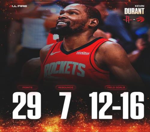 北京時(shí)間3月11日,火箭以113-99大勝猛龍。這場(chǎng)比賽火箭是在末節(jié)一波流擊垮猛龍,不過上半場(chǎng)是杜蘭特與小賈苦苦支撐,37歲的老將有體能時(shí)的確無解,火箭此役后拿到第40場(chǎng)勝利,火箭也重返西部第三的席位(湖人VS森林狼還沒打)。