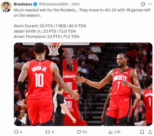 29+7助火箭取第40勝!杜蘭特終露甜美笑容賽后盛贊熱巴蓋世偉業(yè)