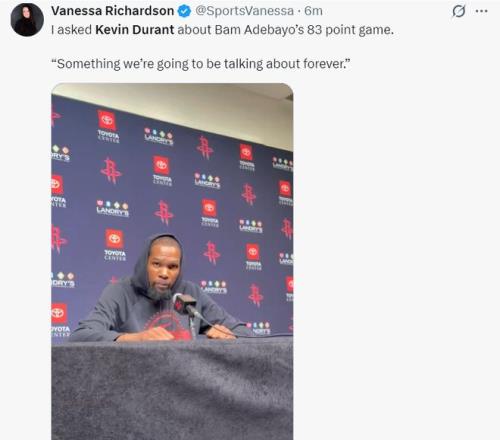 賽后杜蘭特談到阿德巴約單場(chǎng)83分,他說道:我們將永久討論他這場(chǎng)的豐功偉績。