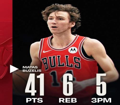 這場(chǎng)比賽,公牛二年級(jí)新秀馬塔斯布澤利斯打出了生涯至今最好的一場(chǎng)比賽:全場(chǎng)出戰(zhàn)45分鐘,投籃28中16,三分15中5,罰球5中4,拿下41分6籃板2助攻2搶斷2蓋帽。