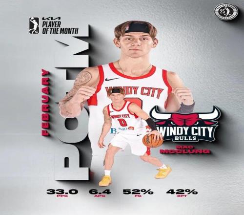 二月份的時(shí)候,麥克朗還當(dāng)選了G聯(lián)賽的月最佳球員,當(dāng)時(shí)他場(chǎng)均可以拿到33分4助攻2搶斷,投籃命中率52%,三分命中率42%。