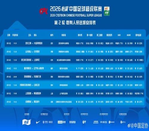3月13日至15日,2026賽季中超聯(lián)賽展開(kāi)第2輪角逐。賽前,中國(guó)足協(xié)發(fā)布了本輪裁判人員選派安排表。