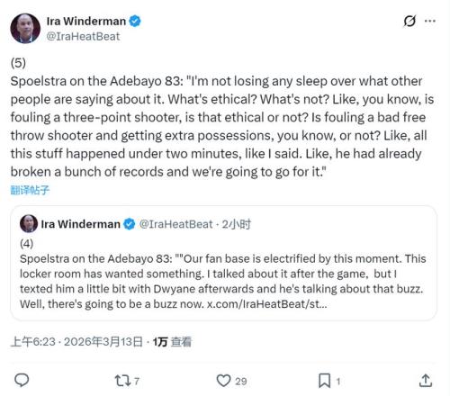 北京時(shí)間3月13日,NBA常規(guī)賽:熱火主場(chǎng)vs雄鹿。對(duì)于外界批評(píng)熱火在領(lǐng)先20+時(shí)仍然故意主動(dòng)犯規(guī),全隊(duì)幫阿德巴約刷分一事,今天賽前熱火主帥斯波回應(yīng):“什么是道德?什么是不道德?對(duì)罰球差的球員故意犯規(guī)算不算道德?”