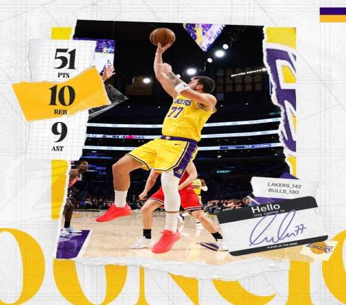 剩下1分44秒前,湖人再次被追到11分,然后東契奇造犯規(guī),在罰球線上得到了個(gè)人第51分。