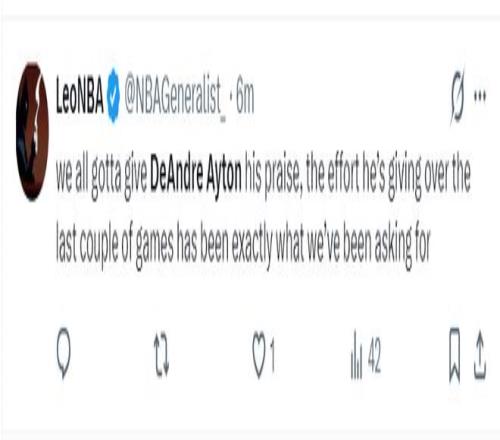 首節(jié)艾頓2中2,上半場20分鐘,10中8,拿到16分8籃板1搶斷0失誤,命中率80%,正負值+12,艾頓在籃下是予取予求。湖人媒體直言艾頓上半場的表現(xiàn)比勒布朗好得多。