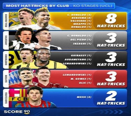 歐冠淘汰賽戴帽榜:皇馬8次居首,尤文多特拜仁3次第二,巴薩第五