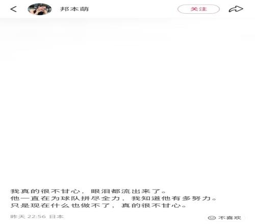 邦本萌寫道:“我真的很不甘心,眼淚都流出來(lái)了。他一直在為球隊(duì)拼盡全力,我知道他有多努力。只是現(xiàn)在什么也做不了,真的很不甘心。