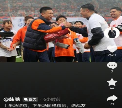 賽后,泰山隊主帥韓鵬更新了個人社交媒體,并寫道:上半場結(jié)束,下半場同樣精彩,送戰(zhàn)友。